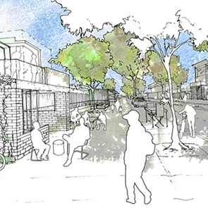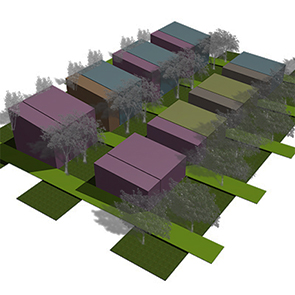 In this scheme, the front gardens are replaced by buildings that offer a street presence to studios, workshops or home offices.